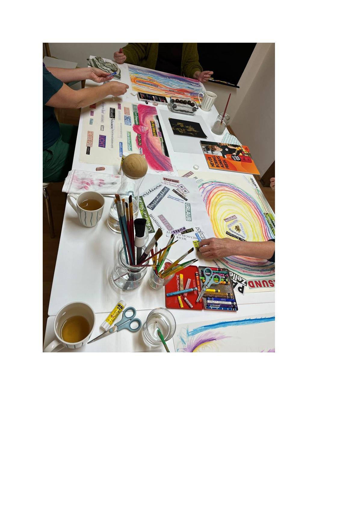 Du arbeitest mit ausgeschnittenen Wörtern aus Zeitungen und Zeitschriften. Du kannst die Wörter zu einem individuellen Text neu zusammensetzen, schneiden oder verschieben. Durch diese Technik entstehen Bilder und momentane Gefühle. Diese Bilder und Gefühle kannst Du im Anschluss mit Farben oder verschiedenen Materialien auf Papier bringen. Der zuvor entstandene Text wird als Abschluss auf das gemalte Bild geklebt.