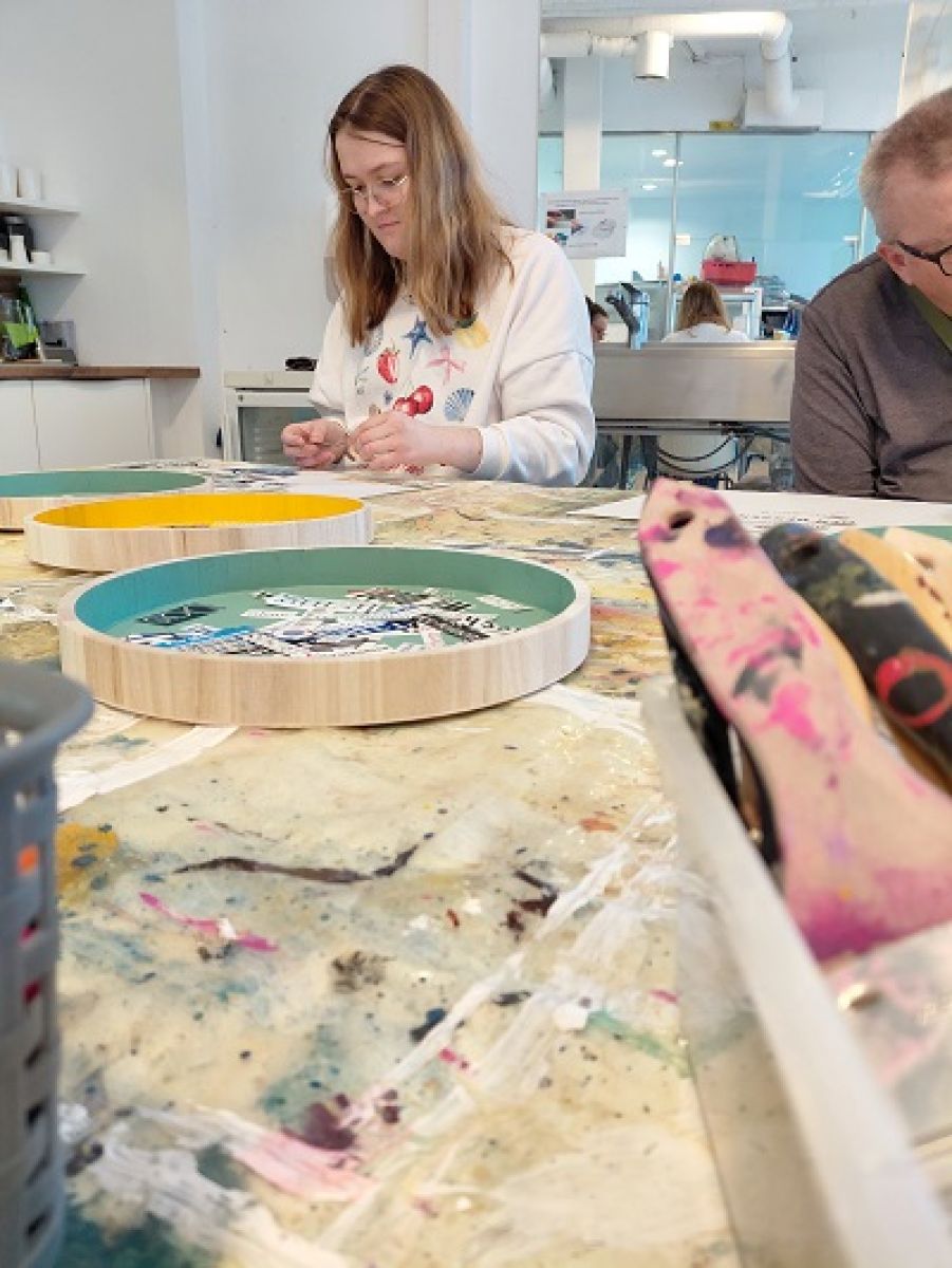 Du arbeitest mit ausgeschnittenen Wörtern aus Zeitungen und Zeitschriften. Du kannst die Wörter zu einem individuellen Text neu zusammensetzen, schneiden oder verschieben. Durch diese Technik entstehen Bilder und momentane Gefühle. Diese Bilder und Gefühle kannst Du im Anschluss mit Farben oder verschiedenen Materialien auf Papier bringen. Der zuvor entstandene Text wird als Abschluss auf das gemalte Bild geklebt.